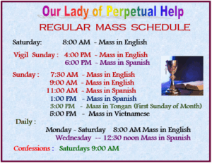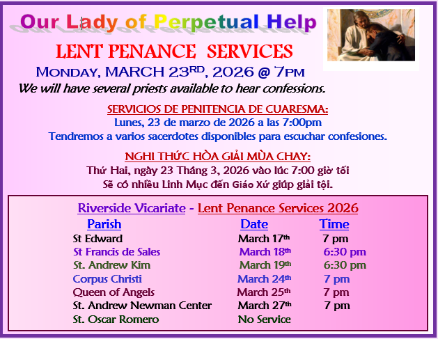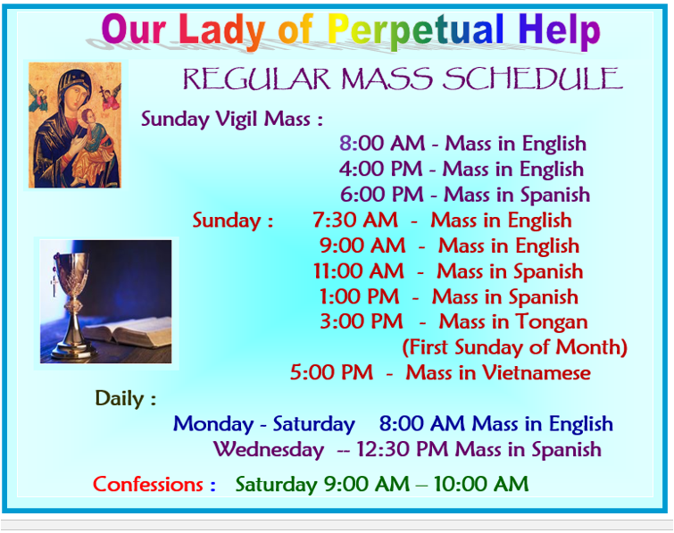 We the community of Our Lady of Perpetual Help in Riverside, as a people of God, are called to unite our diversity into a Christian family. We pledge to value one another as we develop and celebrate our Catholic faith through worship, education, community, outreach, and fellowship